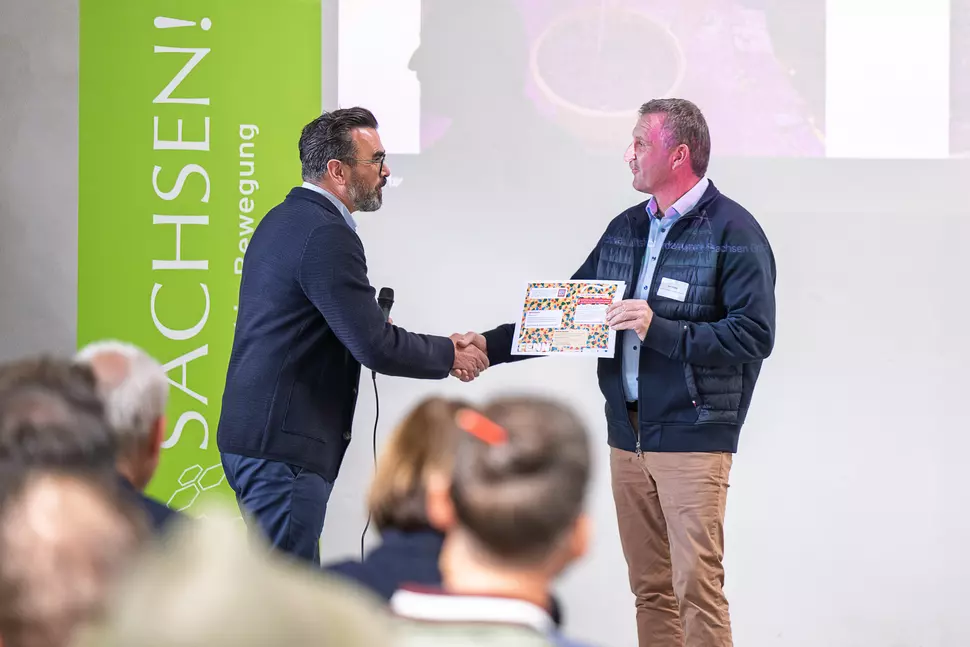 Den länderübegreifenden Kooperationsgedanken unterstrich die Teilnahme einer Delegation aus Oberösterreich von der ARGE s‘Hoiz. Der Kontakt war in diesem Jahr auf einer Reise der WFS zum Thema Möbel/Innenausbau nach Österreich hergestellt worden. Ein besonderes Highlight war in diesem Zusammenhang die Übergabe der Schautafeln zur App-gestützten Spielgeschichte „Fenn und das Geheimnis des Waldes“ an Bürgermeister Jens Müller von Aue-Bad Schlema. Die in Österreich entwickelte Spielgeschichte darf mit Zustimmung der Fördergeber nun auch kostenfrei zur Landesgartenschau in Aue-Bad Schlema 2027 genutzt werden.